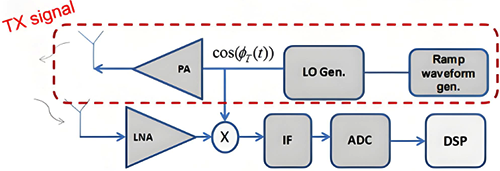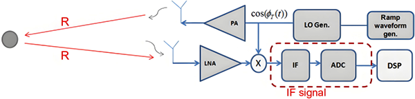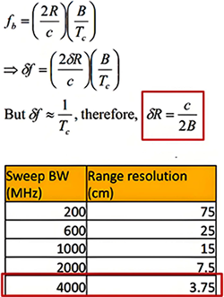 FMCW雷达的优点在于具备扫描宽的RF(射频)带宽(GHZ)的同时还能够保持小的IF(中频、差频或拍频)带宽(MHz)。FMCW雷达优点还有具备高的距离分辨率(例如,在RF带宽为2GHz时距离分辨率达到7.5cm,同时IF仍然可以保持在15MHz以下)。