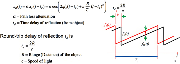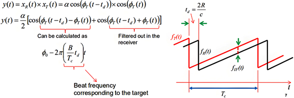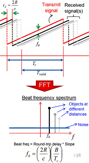 对于静止目标,中频仅与距离(回波的往返延迟)是成比例的。对于FMCW的中频fb来说它等于调频斜率(B/Tc)乘以往返时间td。对于多个目标,中频信号是由多个目标的对应的多个中频组成的,其中每个中频与目标的距离成比例关系,并且这些中频对应不同目标的距离。物体检测和距离(范围)估计通常是通过对接收的中频信号做FFT得到的。