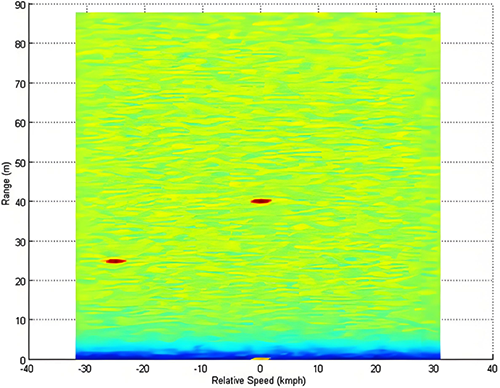 现在的雷达系统中通常首选快速FMCW波形,就是锯齿波,快速FMCW能够提供物体的距离-多普勒二维图,并不存在幽灵目标,如下所示: