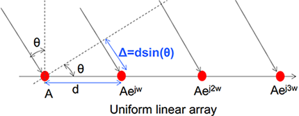 下图是一个均匀四天线的线性阵列,相邻天线的波程差(Δ)取决于到达角θ。