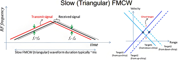 在许多传统的系统中经常使用慢速FMCW波形,也就是所说的三角波,调频持续时间为毫秒级而不是微秒级。慢速FMCW的优点在于对DSP MIPS要求低,不用进行2DFFT处理。但是存在模糊的问题,并且没有好的方法可以获取距离-多普勒图,对于探测范围和多普勒效应的讨论也和锯齿波相类似。