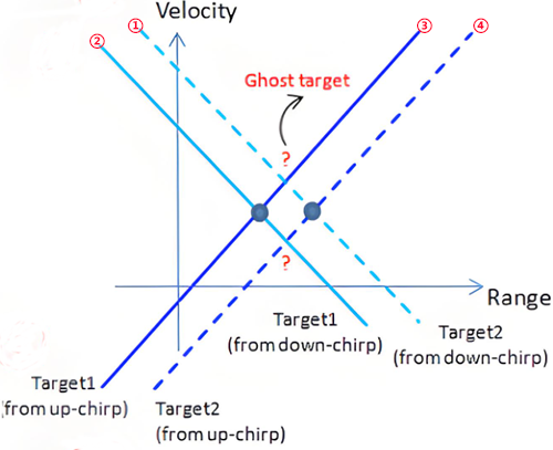 可以看出两个幽灵目标其实是下图中目标1(上升chirp图中的③)与目标2(下降chirp图中的①)以及目标1(下降chirp图中②)与目标2(上升chirp图中的④)。是由不同目标的上升chirp与下降chirp交织导致的。