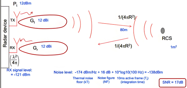 雷达收发电磁波的物理模型如下图所示,其中要确定发射功率Pt=12dBm,也就是说Pt=12dBm-30dB=-18dB(这个地方是dBm编变成了dB)。Gt=Gr=12dBi,Rmax=80m,SNR=17dB,RCS=1m^2,噪声系数NF=16dB。