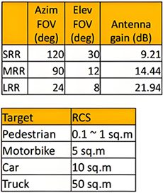 SRR、MRR、LRR其对应的水平FOV俯仰FOV,以及天线增益在下表中给出。同时列出了几个目标的RCS。