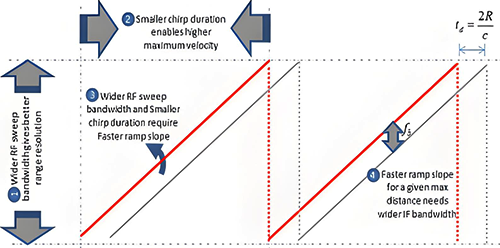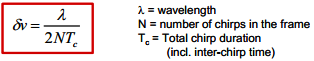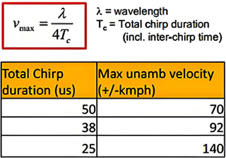 在快速调频连续波(FMCW)调制中的最大无模糊速度取决于线性调制周期-更高的速度需要更陡的斜坡。最大速度的公式如下,λ是波长,Tc是chirp持续时间(包含chirp间时间):