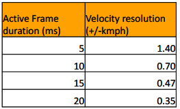 它其实和距离分辨率一样也是取决于SNR ,同样速度精度通常也是速度分辨率的一部分。另外给出一个速度分辨率和帧周期的表格。大家可以按照这个计算一下练练手。